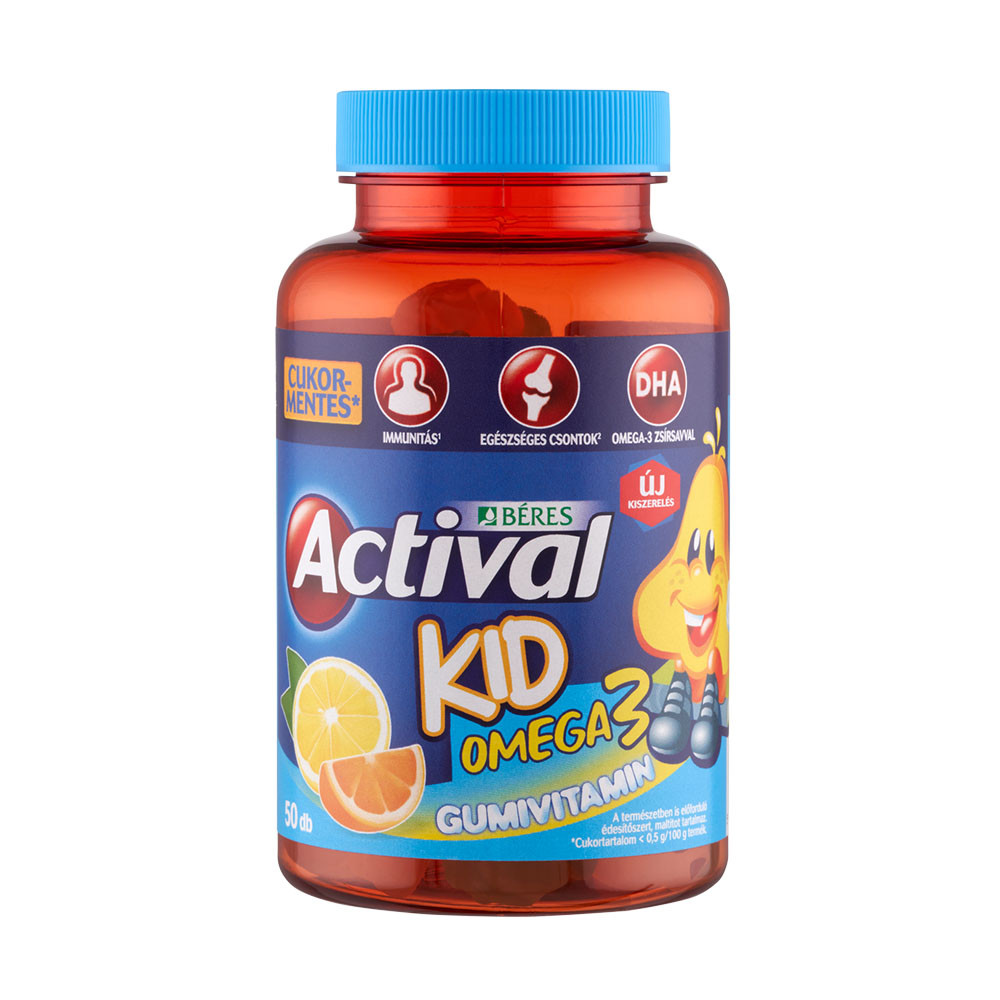 Actival Kid Omega-3 Gumivitamin cukormentes gumitabletta étrend-kiegészítő multivitamin DHA-val, oligofruktózzal és édesítőszerrel finom citrom és narancs ízben elsősorban gyermekek részére.
