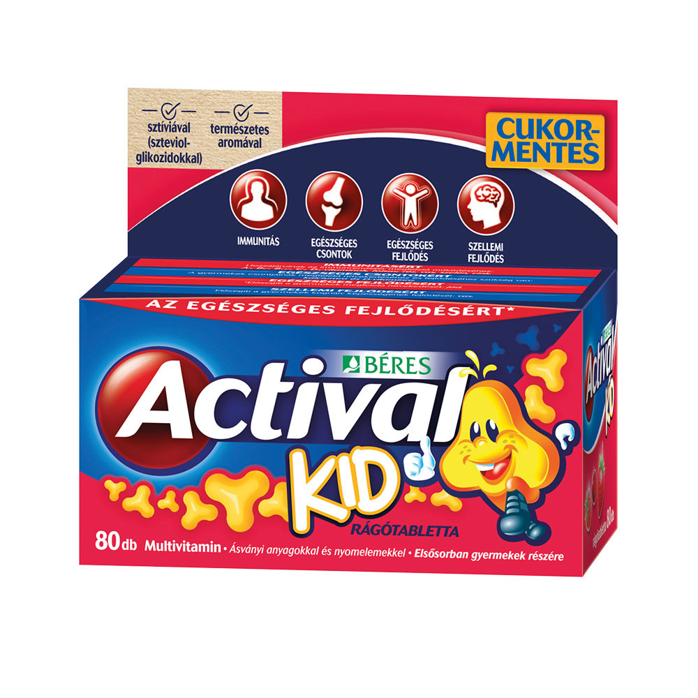 A természetes aromával készült, és sztíviával (szteviol-glikozidokkal) is édesített Actival Kid rágótabletta nemcsak cukormentes és finom, hanem a benne lévő összetevők közül a cink, a szelén, a réz, a vas, a folsav, az A- B6-, B12-, D- és C-vitamin hozzájárulnak az immunrendszer megfelelő működéséhez.