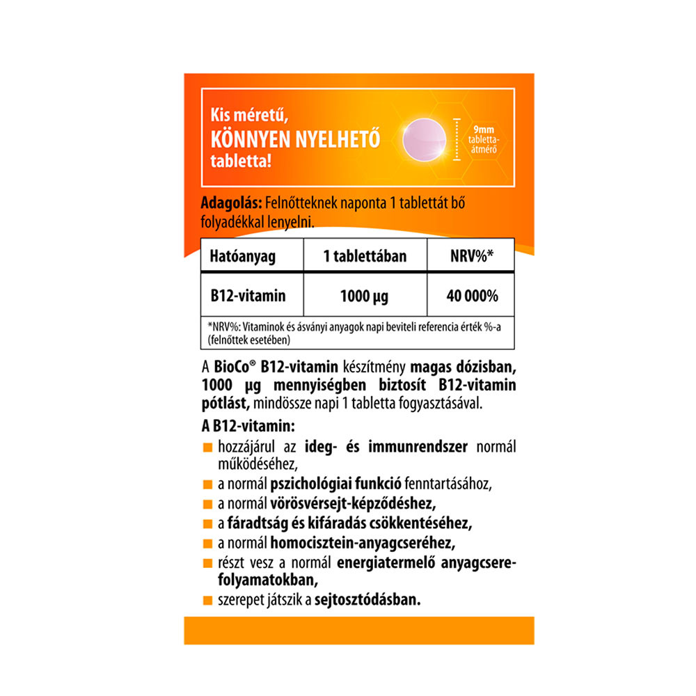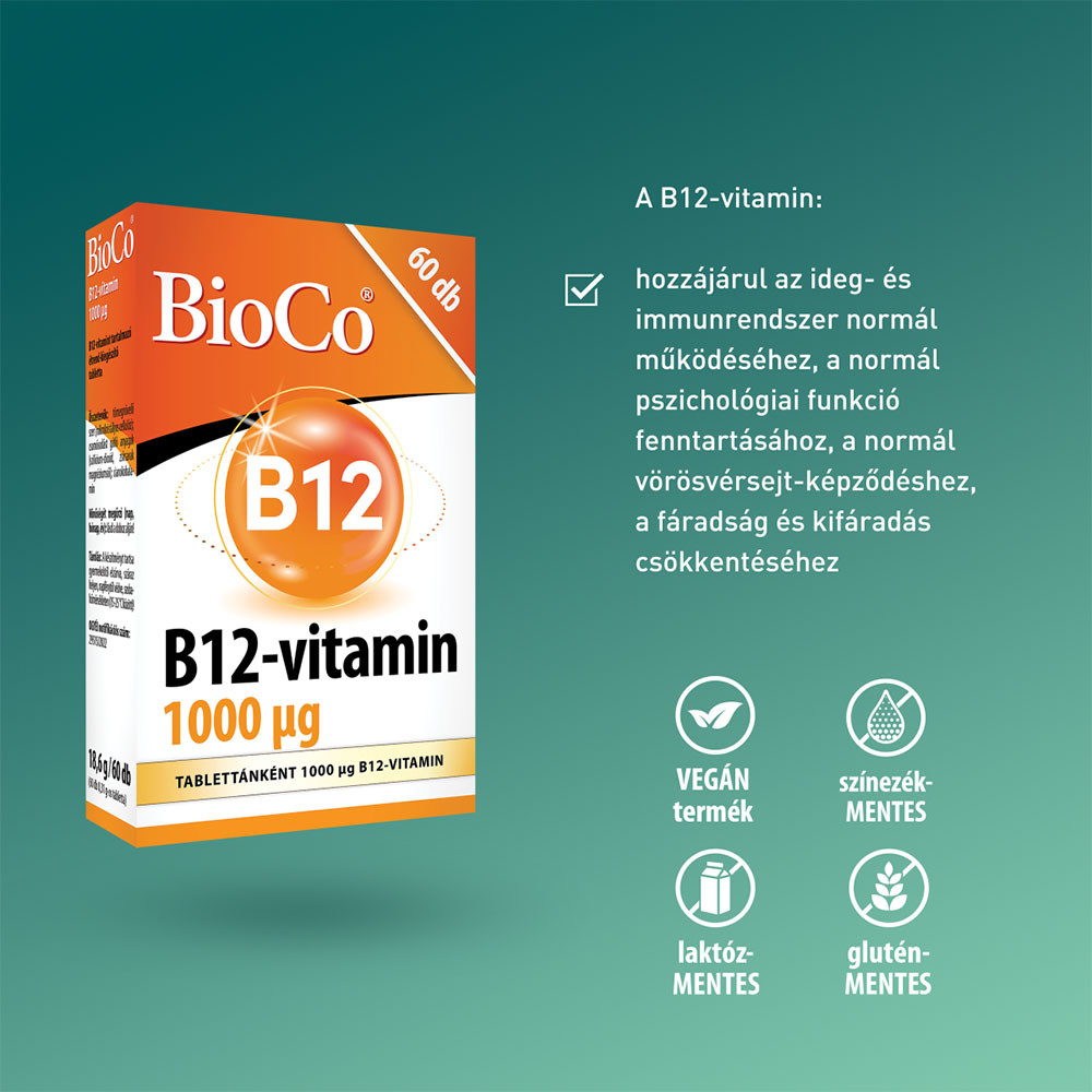 A BioCo® B12-vitamin készítmény magas dózisban, 1000 μg mennyiségben biztosít B12-vitamin pótlást, mindössze napi 1 tabletta fogyasztásával.