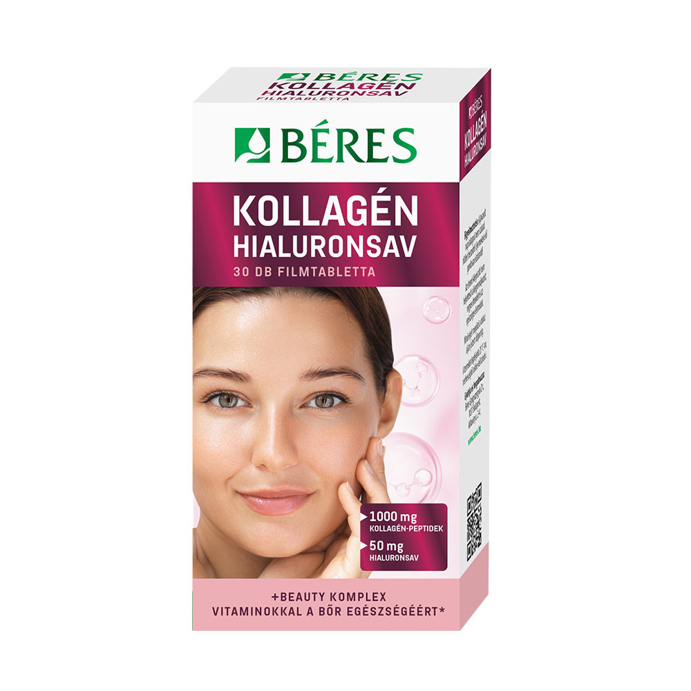 Béres Kollagén-Hialuronsav filmtabletta étrend-kiegészítő készítmény hidrolizált kollagénnel, hialuronsavval, koenzim Q10-zel, cinkkel és Beauty Komplex vitaminokkal.