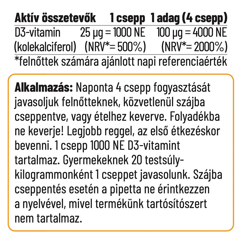 Adagolás: Naponta 4 csepp fogyasztását javasoljuk felnőtteknek, közvetlenül szájba cseppentve, vagy ételhez keverve. Folyadékba ne keverje! Legjobb reggel, az első étkezéskor bevenni. 1 csepp 1000 NE D3-vitamint tartalmaz. Gyermekeknek 20 testsúlykilogrammonként 1 cseppet javasolunk. Szájba cseppentés esetén a pipetta ne érintkezzen a nyelvével, mivel termékünk tartósítószert nem tartalmaz. Csak felnőttek fogyaszthatják.