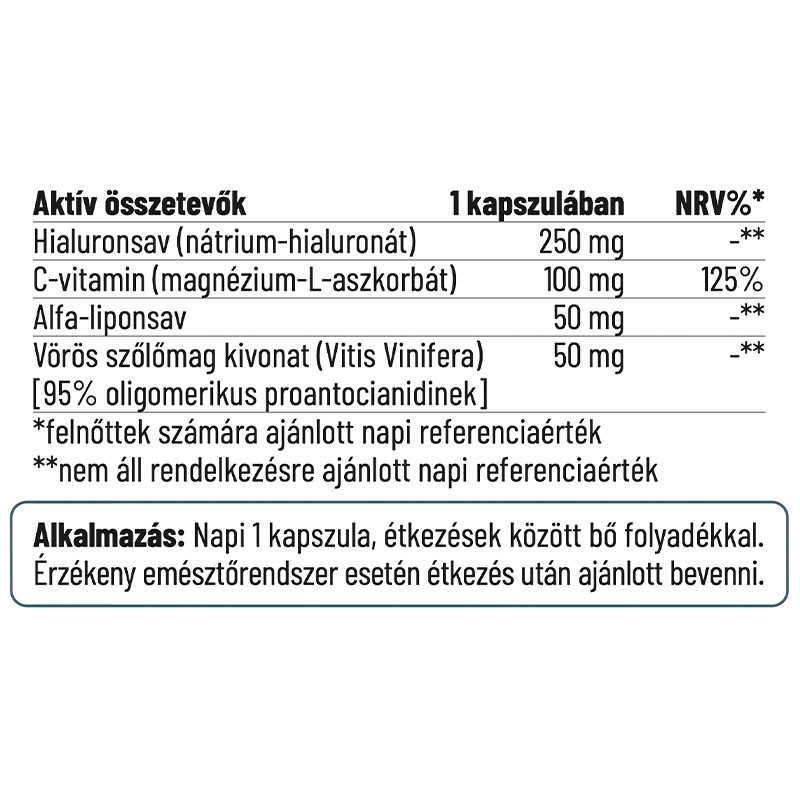 Összetevők***: nátrium-hialuronát, rizsliszt, kapszulatok (hidroxipropilmetil- cellulóz), magnézium-L-aszkorbát, vörös szőlőmag kivonat, alfa-liponsav, csomósodást gátló (leucin aminosav)