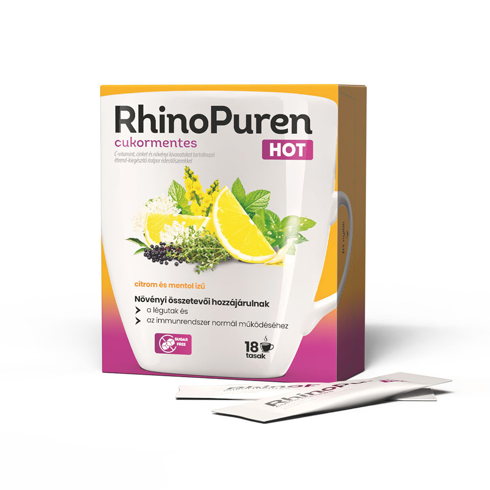 A  RhinoPuren HOT cukormenteskellemes ízű forró italpor a légutak és az immunrendszer normál működését támogató növényi kivonatokkal, mint az Andrographispaniculata, az ökörfarkkóró, a kakukkfű és a borsmenta, valamint az immunrendszer normál működéséhez hozzájáruló C-vitaminnal és cinkkel.